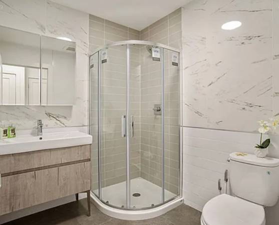• Contemporary bathrooms with glass shower enclosures, modern tile work, and ample vanity storage