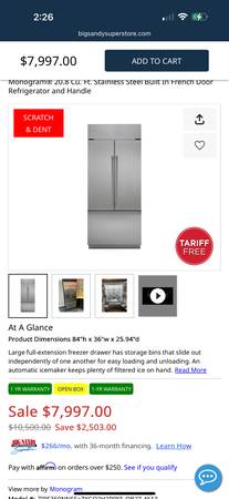 Selling my GE Monogram New Open Box Stainless Steel 36” Inch Wide 3-Door Built In Fridge with Ice Maker. Height is 84” Inch and Counter Depth 24” Inch Depth. Also have a New Open Box GE Monogram Gas Range 30” Inch Wide. Asking $8,800 Cash. We Can Deliver. Fridge Retails for $10,500 and Gas Range Retails for $5,700 Plus Tax. Call or Text Me show contact info