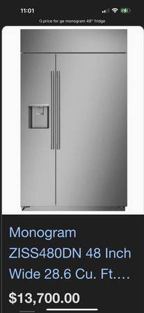 Selling my New Open Box GE Monogram Stainless Steel 48” Inch Wide Side by Side Fridge w/Ice & Water Maker. Height is 84” Inch and Counter Depth 24” Inch Depth. Has 2 Year Manufacture Warranty. Has tiny tiny dings on Door but still looks good. Asking $6,900 Cash. Includes Free Delivery. Fridge Retails for $13,700 Plus Tax. Call or Text Me show contact info