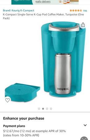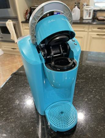 The Keurig K-Compact K35 Single Serve Coffee Maker in Turquoise/Blue is a stylish and compact coffee maker that allows you to easily brew your favorite espresso drinks at home. With a 1.2 qt water tank capacity and a quick heat-up time of 20-25 seconds, this pod coffee machine is perfect for making specialty coffee drinks like espresso, latte macchiato, and mocha. The analog control panel and wall plug-in power source make it easy to use, while the shiny finish adds a touch of sophistication to any kitchen. Compatible with Aquaclean water filtration, this Keurig model comes with a water tank and drip tray for convenient use. Comes with some K cups. For sale $80 obo