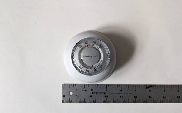 This was used for our heating; we upgraded to a Nest and no longer need this. It's about 3" in diameter. And about 1.5" in thickness (from the wall). No mounting screws or anything, but they should...