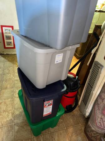 This is for all four of these storage tote containers from different brands. They have been used before but all work great still to use. The Rubbermaid is biggest 22 gallon. There is a 20 gallon and two 18 gallon storage containers. Put pics of all email or text with any questions.