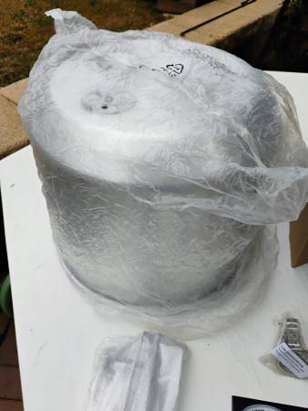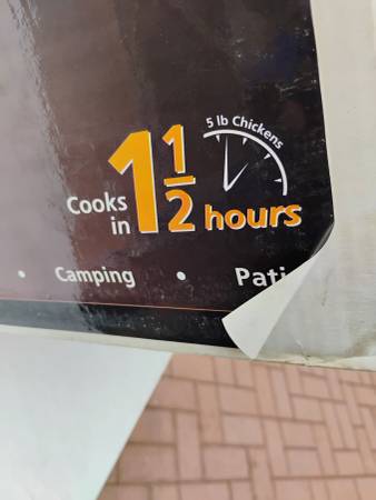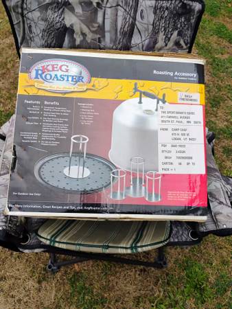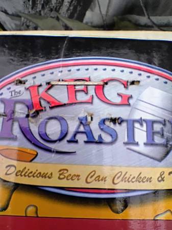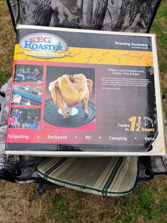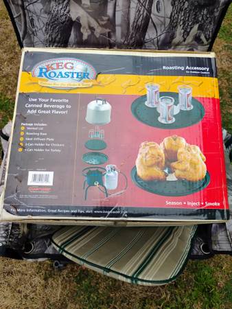 Brand New Camp Chef Keg Roaster KEG-R. The unit comes with the heat diffuser plate, drip plate, a three chicken/hen roasting platform/post(s), a turkey roasting platform/post, built-in thermometer (you must mount), handle (you must mount), and instruction/recipe book. Use Beer in cans, soda in cans or any canned beverage for cooking. I prefer beer or nectar. I had to open it to take pictures so that you can see all the original packing and wrapping.