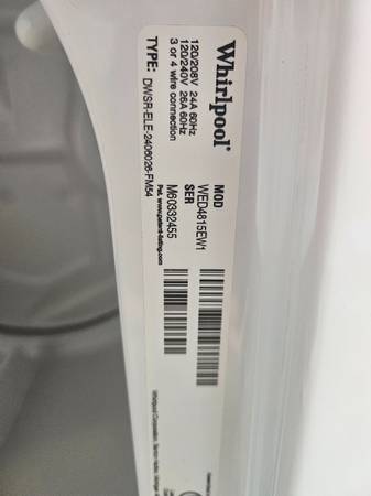 I have an Whirlpool electric dryer in excellent condition if interested please call or text for quickest response. Sold as is where is cash only. I think it's about 10 years old and I was told it hasn't been used in many years but it works great other than that I don't know anything about it that's why it's so cheap. I just want a gone