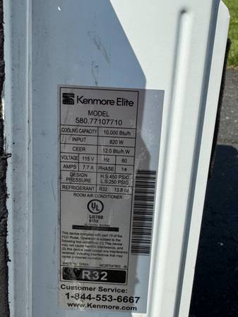 For sale is a Kenmore Elite 580.77107710 10000 BTU 110v smart window air conditioner. The unit performs as expected. The front face plate attaches at three points: the fourth attachment point is broken. There is some tape attached and some wear from use. Several remotes are included.