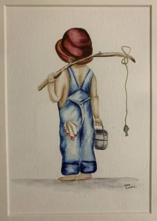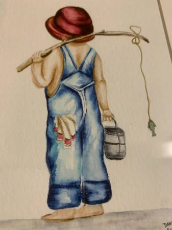 original signed Dana Conner watercolor painting boy girl child fishing - $60 (Essex / Caldwell)