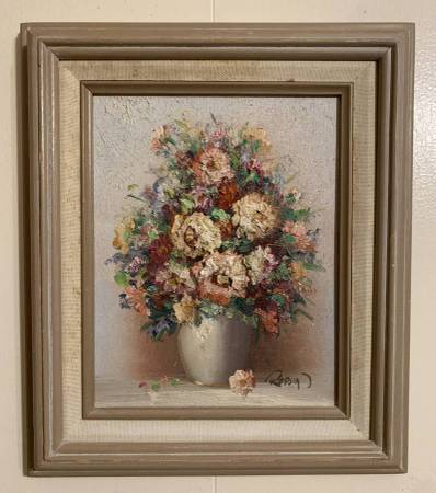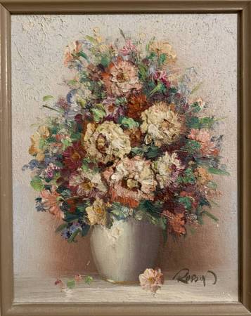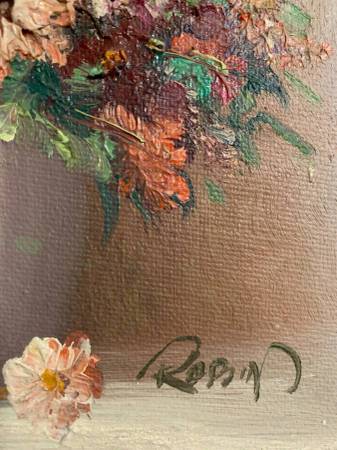 original signed Robin oil board still life floral painting flowers - $150 (Essex / Caldwell)