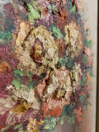 Beautiful oil-on-board painting in which many of the flowers were created to be raised off the canvas for a realistic, 3D effect. Signed by artist "Robin".