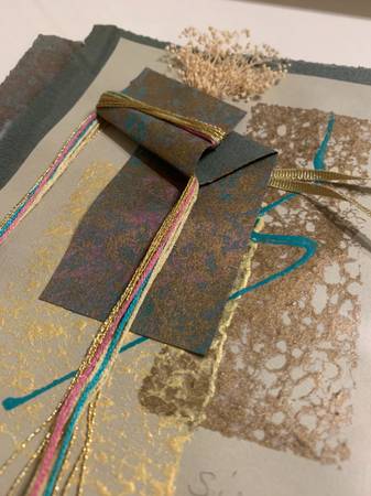 The artwork appears to utilize handmade paper, possibly dyed with natural substances and includes elements of textiles or threads. Dried botanical elements, possibly seeds or small flowers, are also integrated into the upper portion of the piece.
