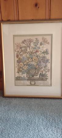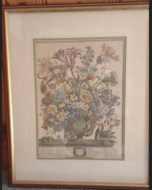 This beautiful vintage print features a stunning flower design originally created by Robert Furber in 1790. Beautifully framed and matted in excellent condition. This high-quality reproduction has all the beauty of the original. The flowers in the bouquet are listed near the bottom of the piece. Its botanical theme and framing make it a standout piece that is sure to impress.