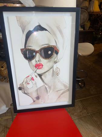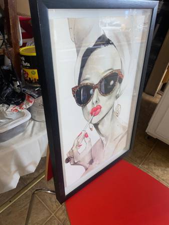 To me this is a terrific box style framed picture of misty black and white with a lady with big red lips. The frame is black and issue is all white except for the lady and Red lips. I put my red chair as back ground to show how with right color around picture really pops. Measures 24 inches high 16 long. Email or text with any questions.
