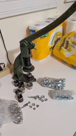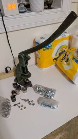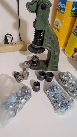 Hand fabric button maker machine with 2 sizes of Dies, cutters and plenty of metal buttons. For Upholstery and dressmaking fabrics. Price: $25 only
