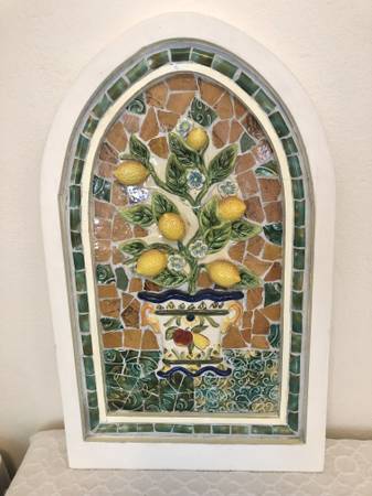 Large approx 26” x 16” display with rare 3 dimension tiles of a lemon tree and vase. For home, office or patio, can embed art into backdrop of other tiles ( like over stove) or display as is. Frame can be painted to match decor, imported from Italy