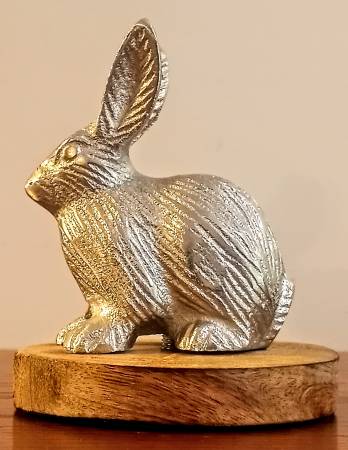 Dimensions: Approx. 5" Rabbit Height, Wooden base/platform 4" diameter.