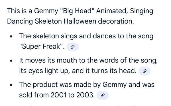 Animated, Singing Dancing Skeleton Big Head by Gemmy Industries singing “ Super Freak” by Rick James Height: 18” tall Original Owner Manufactured from 2001-2003 Nice Halloween collectible for your...