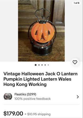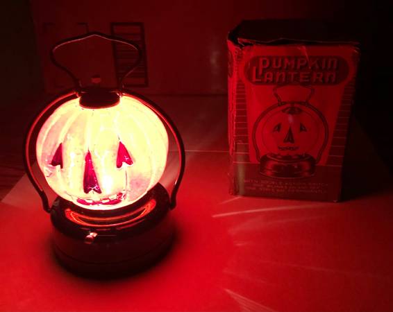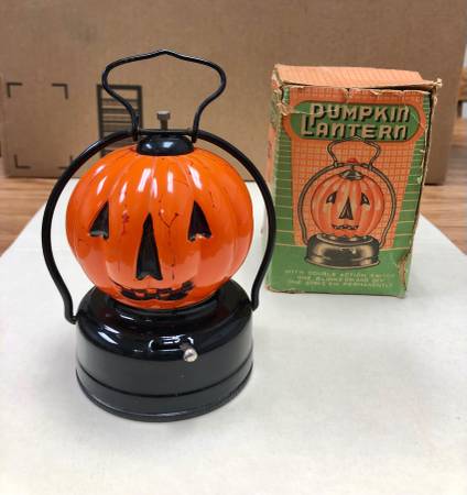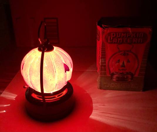 If this is listed - it is available 1950’s Halloween Pumpkin Lantern Pumpkin is Glass Battery Operated ( need 2-C’s ) Made in Hong Kong Lantern is 5” tall with handle Minor paint loss by nose on one...