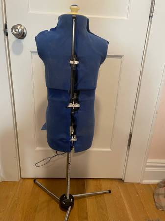 Child's sewing mannequin dress form. Adjusts to all children's sizes (but not toddler sizes) via multiple dials, so you can adjust specific body areas to suit your needs. This was very useful to us, since our kids didn't fit the normal sizing charts. The blue fabric covering is coming loose, but the rest of the form is in good condition.