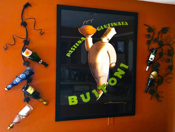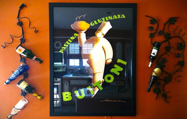 This is a gorgeous Pastina Glutinata Buitoni poster art that has been hanging in our Kitchen. I acquired the poster and then had it professionally framed in a beautiful matte black frame.