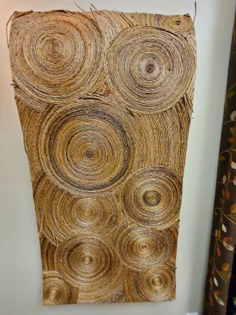 Wicker wall art Dimensions: 28" wide x 54" tall All loose wicker strands in pictures have been reglued. I do not know the manufacturer. If interested, please respond with a phone number. $80.00