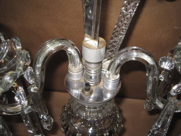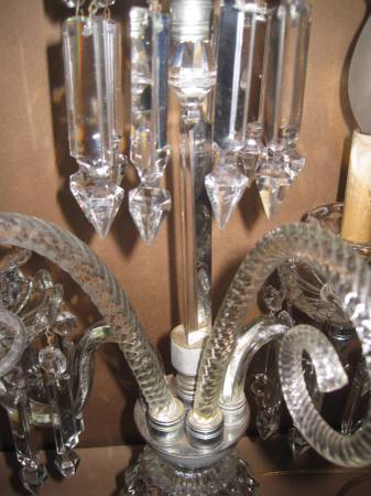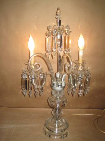 Antique glass table lamp. It stands 26 1/2" tall, 16" wide, and 10" deep. It has two arms with 10 prisms on each bobeche. The top bobech has 10 prisms. There are two blown glass swirl pieces on the first tier. The whole lamp is glass including the glass base. The bobeche on the left arm has a 1" secure hairline from the edge. See picture 12. A few of the prisms have tiny flea bites. It has the original on/off switch. It works perfectly