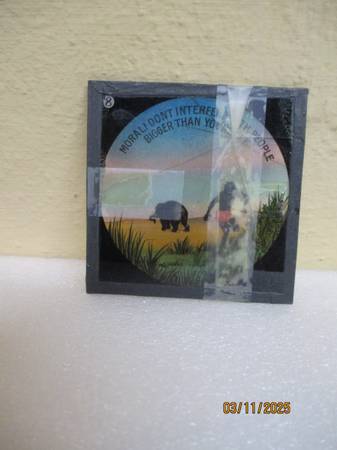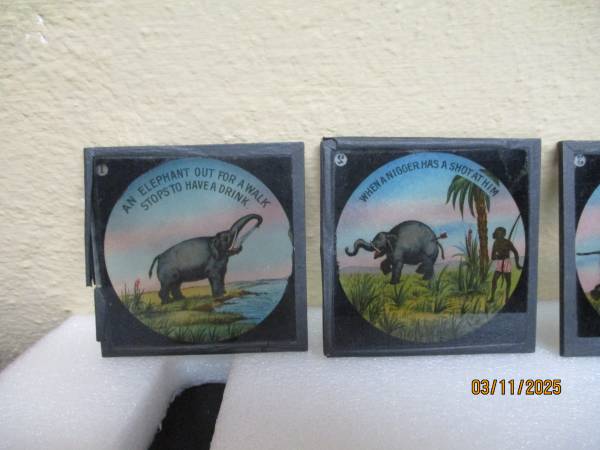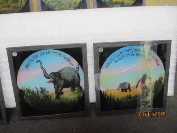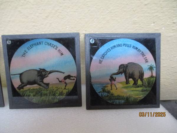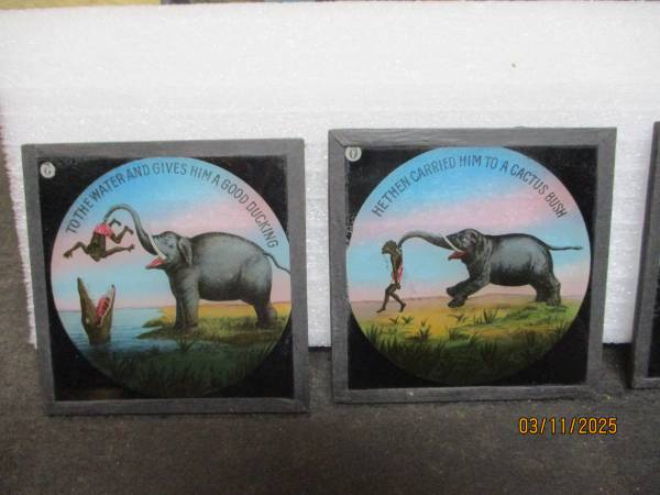 Antique set of 6 magic lantern slides telling a moral tale about an elephant and a native. No. 1 An elephant out for a walk stops to have a drink. No.2 When a native has a shot at him. No. 3 The elephant chases him. No. 4 He catches him and pulls him by the ear. No. 5 To the water and gives him a good ducking. No. 6 He then carried him to a cactus bush. No. 7 And throws him among the prickles. No. 8 Moral! Don't interfere with people bigger than yourself. No. 7 is broken and taped long ago. The other slides are fine. The colors are clear and sharp.