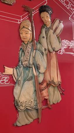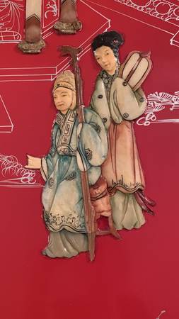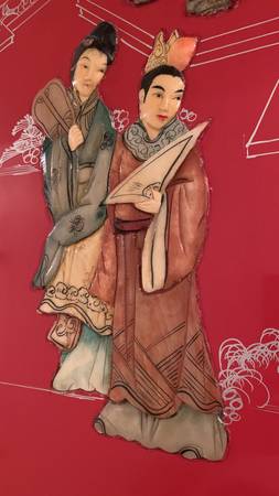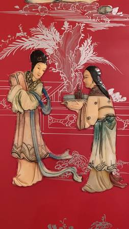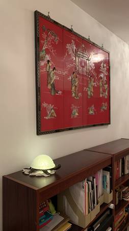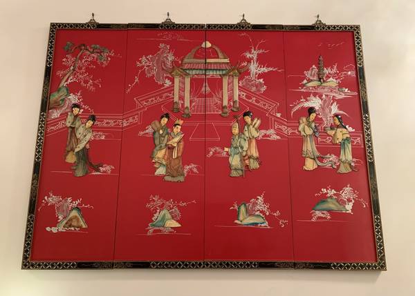 Four-panel lacquered screen with traditional courtyard scene. Beautiful stone carvings. Brought over from China in the mid-1900's.