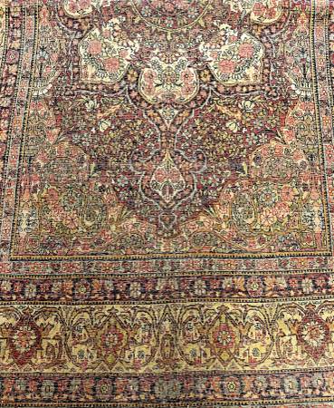 This product is a vintage hand-made Persian rug measuring 4'3 x 6'7. It showcases traditional Persian design and is made of 100% wool, making it a high-quality and unique addition to any home décor. The rug features a multicolor palette that adds a touch of history and culture to any space with its Persian origins.
