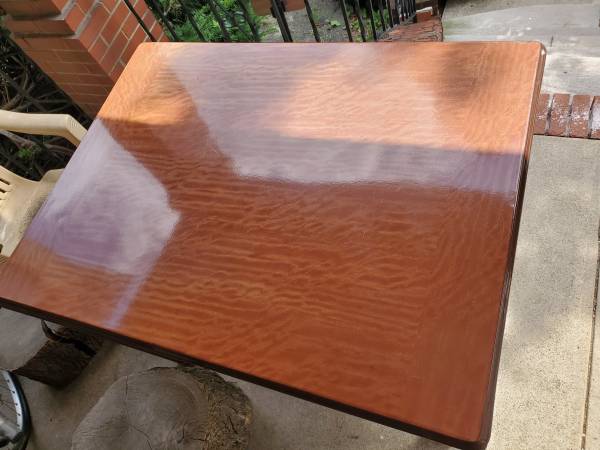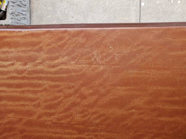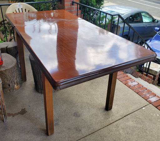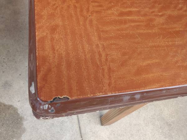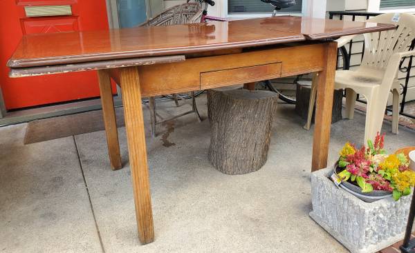Enamel top kitchen table, 1930s - 40s. Faux wood enamel pattern with wood frame & legs. Length expands from 42" to 63". Single drawer with divider. Some scratching & 1 chip on enamel,...