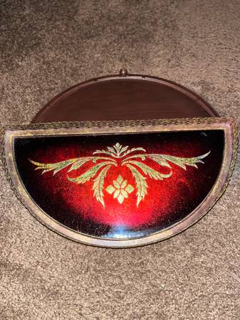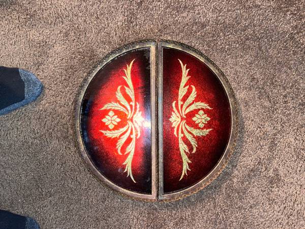 Crimson Red and gold foil art under glass with metal filigree border wood bottom with 3 ball feet - very heavy- well made. About 12” across.