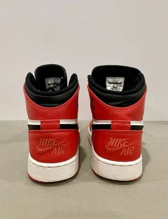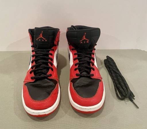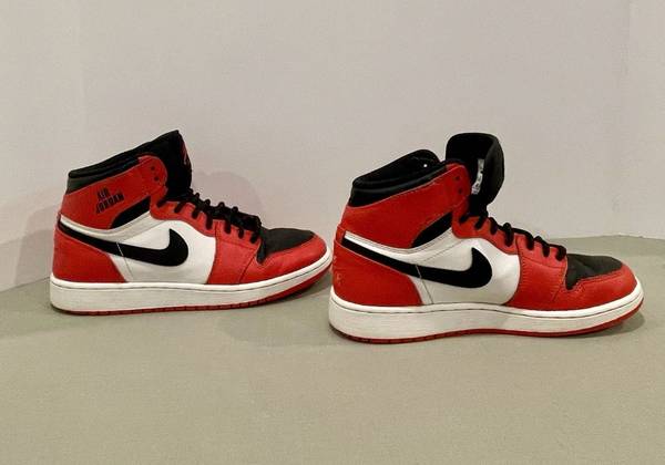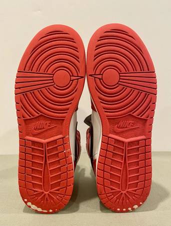 Pre-owned Air Jordan 1 Rare Air in a bold red, black, and white colorway. Youth size 5.5Y (equivalent to women’s 7). Features “RARE AIR” branding on the tongue and classic Nike Air logo on the heel. Shoes show visible signs of wear including creasing, scuffs on the midsole and outsole, and light wear to the inner lining. Extra laces included.