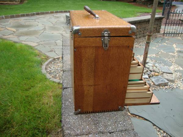 Here we have a vintage H Gerstner & Sons oak machinists chest, Model 42, which has been completely restored. All of the following components are original to the chest: the handle, the frame and mirror, the stop hinges, all the corner hardware, the snap locks, the lock , the plunger pins, the drawer pulls, the finger pull, the front lid pins, the front lid plates, and the front lid hinges. Only the green felt has been replaced. The key was made by H Gerstner using an original A50M21 key for the guide, and testing it in an original A50M21 lockto insure it works. The chest measures 20" wide, 15 3/4" tall, and 9 3/8" deep. H. Gerstner & Sons is widely considered to make the finest wooden machinists chests. Now is your chance to own one, and it looks like the day it left the factory in Dayton.