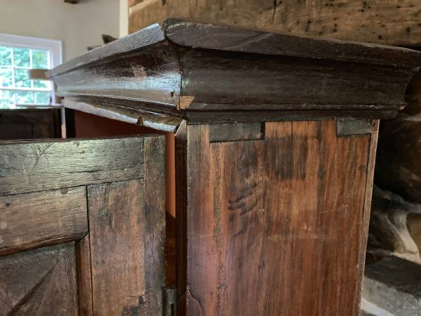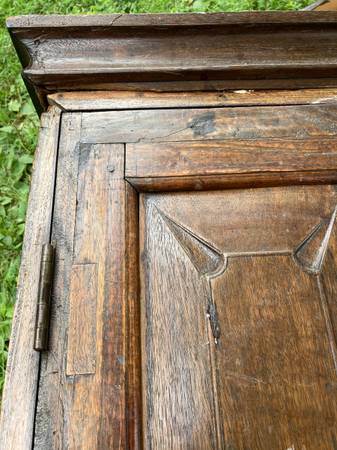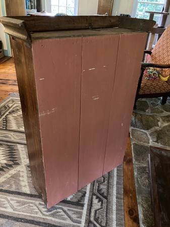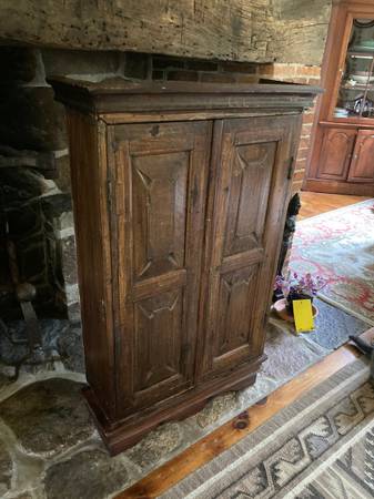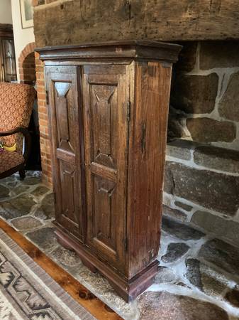 This is a very old antique cabinet which has been rebuilt several times over its long life. It is very solid and heavy with thick wood. It stands 43” tall, 11” deep, and 30.5” wide. Tall. Old...