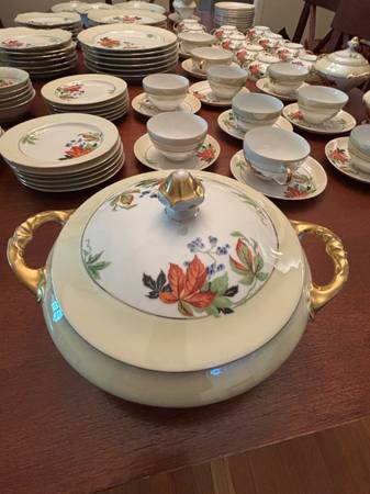 Get ready for the holidays with a beautifully set table! This makes a beautiful Thanksgiving table! 96 pc fine China set AMC Germany, ACC7, Autumn Leaves pattern From Silesia, Germany Art pottery...