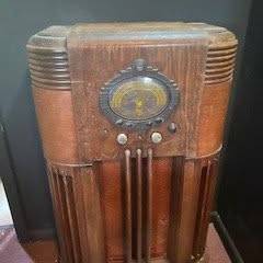 Beautiful antique floor-standing console radio crafted from rich brown wood with classic Art Deco styling. Likely produced in the late 1930s to early 1940s, this piece showcases period craftsmanship with curved edges, detailed veneer work, and an integrated speaker grille. The tuning dials, knobs, and decorative faceplate retain their original vintage charm.