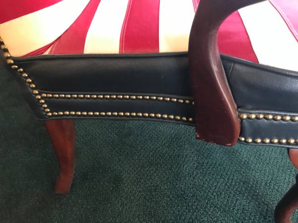 Betsy Ross Chair and ottoman designed by America at Heart and manufactured by Suggs & Hardin (Historic Collection). These high quality pieces evoke a classic American feel crafted from the American Flag and durable leather. The Queen Anne Flag upholstered chair measures 42” H, 23” deep, 26” width. The back of the chair is covered with navy leather. The ottoman is 19” H, 26” wide and 20” deep.