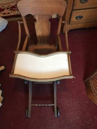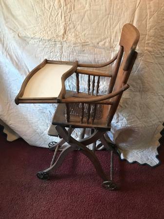 Antique oak high chair is in excellent condition. It measures 40” H, 17 1/2” across, 20” deep. It is solid oak, cane seat and original metal wheels. The chair converts into a low lying play seat. Everything is original except the tray. This chair would make a great conversation piece and a special place for collectible dolls, etc.