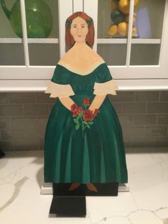 Unique doll hand painted on a thin piece of tin. The piece measures 31” H x 14 1/2” W. It is a beautiful piece of folk art and looks great in front of a fireplace. The piece needs to rest on...