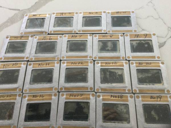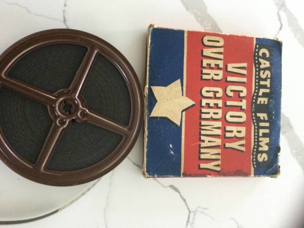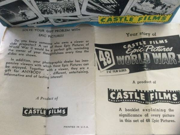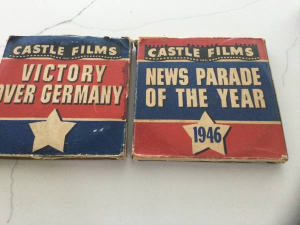 2- 16 mm Castle Films. News Parade of the Year 1946 and Victory Over Germany. One box of 48 2 x 2 Castle Film slides from WW II. All in good condition. The pictures can be clearly seen when held up to the light. 35 of the 48 slides have been remounted because of warping.