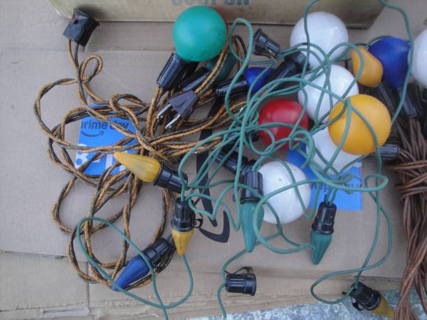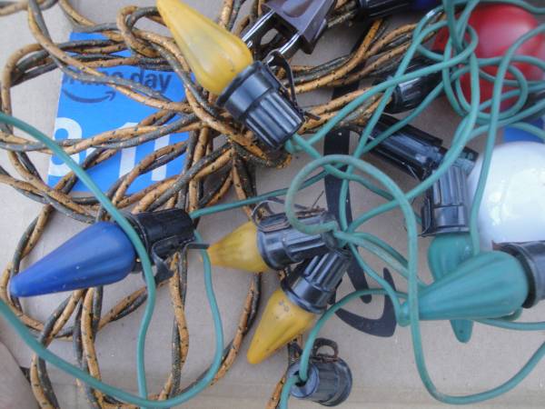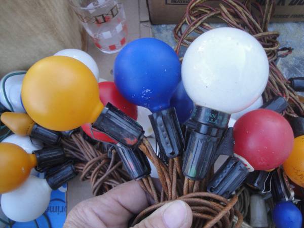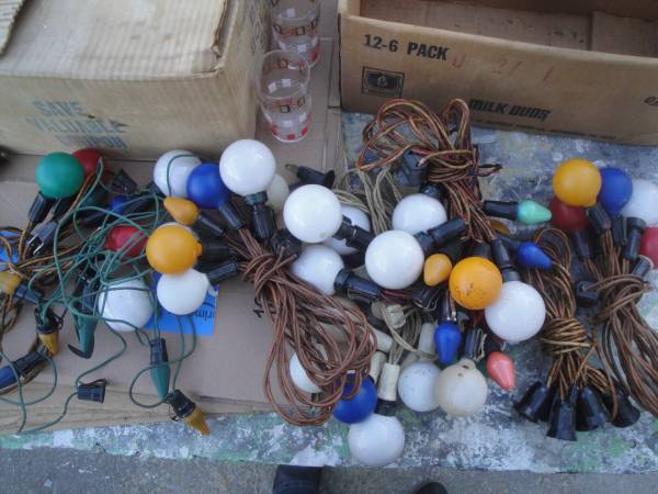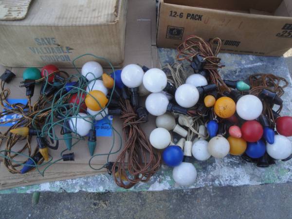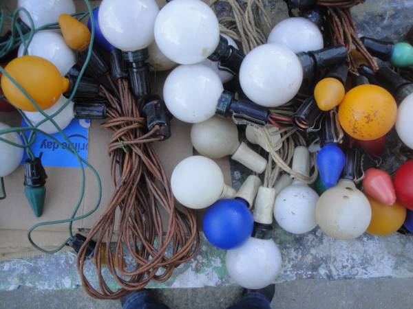 Collection of antique / vintage 1920s / 30s Christmas tree light strings and bulbs. The pointy ones are C7s. The round bulbs (some white ones marked "Sylvania") are unusual. The white ones were supposed to resemble snowballs. There are a few of the more modern rounded ones introduced in the late 1950s when they were still decorating for Christmas. These are from a local family (Krauss) who lived on Prospect in Pompton Plains for two generations. Packed away since the mid 1960s. These were all functioning when the family last used them.