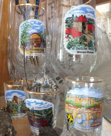 • Vintage 1980 Germany decal style 2 wine glasses, and 3 assorted shot glasses, all never used, have been in my cabinet $15.00