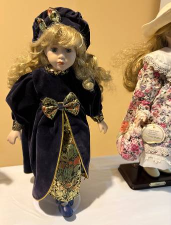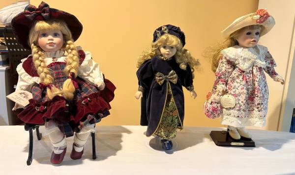 Selling a set of three collectible porcelain dolls. They are all dressed in different outfits and have unique features. Great for collectors or as decorative items!