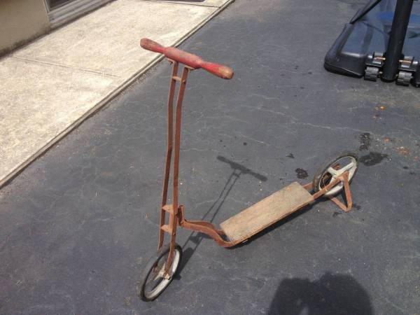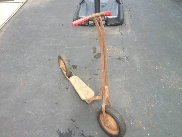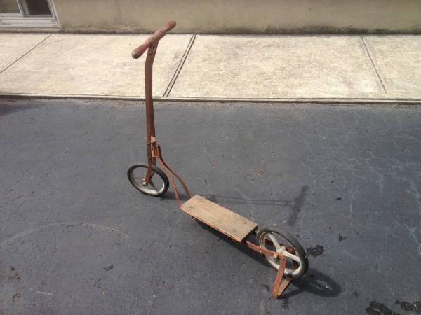 Two Antique and Vintage all original Metal and Wood "Rare" Scooters. These are untouched all original scooters I purchased around 10 years ago from original owner (an elderly woman most likely in her late 80's who said one was hers as a child and the other her brothers - they are most likely from early 1920's or 1930's). Both are solid heavy metal with rubber wheels and wood decks & handles both showing some of the original paint - both excellent condition for their age and can be ridden or displayed. The larger scooter is made by Auto Wheel Coaster Co Inc made in North Tonawanda NY (near Buffalo NY) with Hewitt Rubber Co Wheels (sold rubber 10x2 wheels), original metal kickstand and shows very nice. The smaller peddle scooter I'm unsure of maker but it also has solid rubber wheels, very unique rims, original metal kickstand and also shows and even rides very well. Very unique and usual "Rare" vintage scooters - great for displaying or for a child to have fun with. Could easilly be re-finished but I think they look great just the way they are. Will sell both for just $175.
