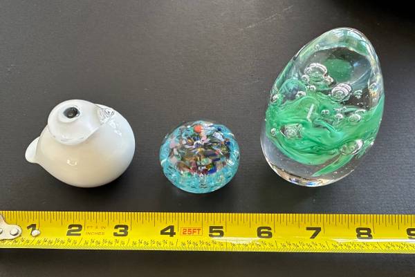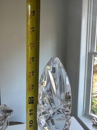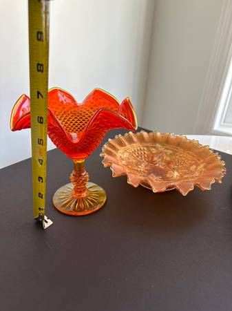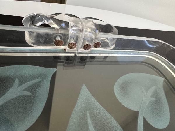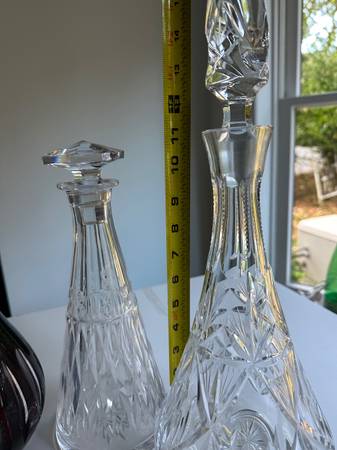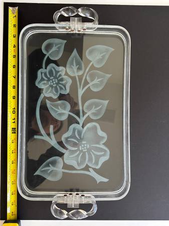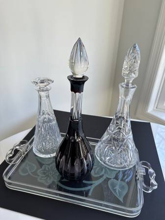 See photos, gorgeous pieces 1. 3 crystal glass decanters with stoppers High quality, burgundy one has a slight ship at rim- see photos $150 for 3 2. Mcm etched glass and Lucite tray Dorothy Thorpe...