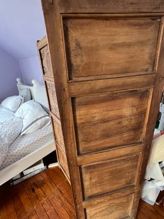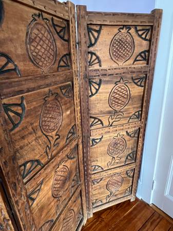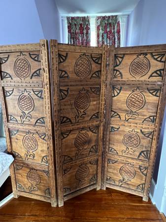 Antique Carved Wooden Screen/Room Divider (Trifold) in Excellent Condition. 21”w each panel x 65”h each panel. Attached with iron clasps. Smoke free household.