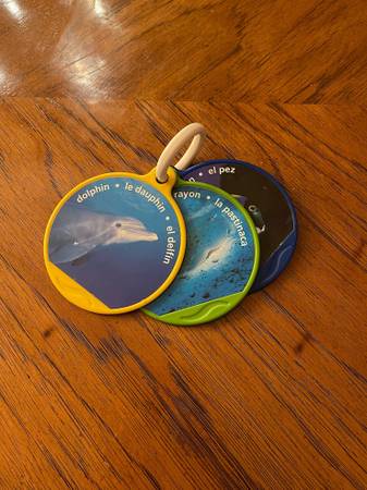 I believe this is a Baby Einstein toy but Iām not sure. There are three double sided rings, each side has an ocean animal and its name in 3 languages.