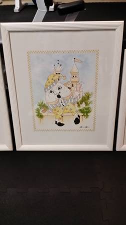 Framed Watercolor Lithograph by Kimberly Grant with "Baby Safe" Plexi-Glass and white wood frame.