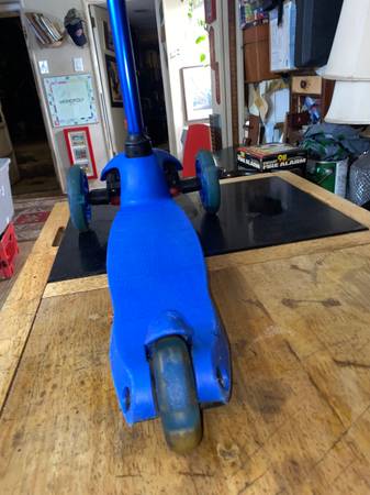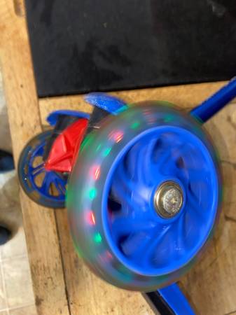 This is a Rugged Racer brand kid or child three wheel scooter. The two front wheels light up when rolling fast. Has adjustable height and color is blue. Works great and still has plenty of miles to go on it for a kid to play on. The one handle the ball on end that's rubber has come off but no effect on scooter. Email or text with any questions.