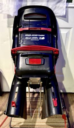 The adjustable Römer Rear Child Bike Seat in grey and red features a sturdy frame mount for stability and easy installation on the rear of a bicycle. With dimensions of 30 inches in height, 19 inches in length, and 19 inches in width, this seat is designed to comfortably accommodate a child while cycling. The Römer brand is known for its quality and durability, making this child bike seat a reliable option for family rides.