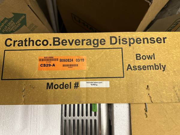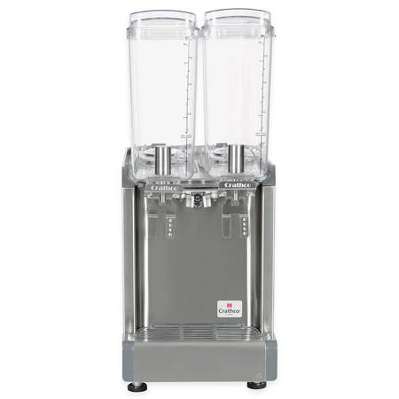 Brand new Crathco CS-2E-16-290 refrigerated cold drink dispenser (Beverage dispenser). Factory-sealed (new in box). Dual 2.4-gal bowls (4.8 gal total) with agitator mixing—ideal for juice, lemonade, horchata, aguas frescas, iced tea, etc. Removable bowls, stainless base, 35–41°F holding, bottom air intake/rear exhaust. Includes bowls, lids, drip tray and standard accessories as packaged by Crathco.
