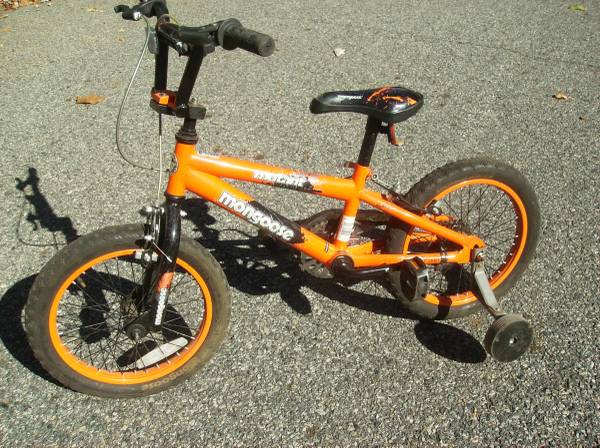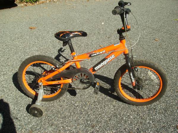 Mongoose Mutant BMX Style Bike 16" Kids Bike Training Wheels Front and Rear Hand Brakes Coaster Brake Age Group 3 – 7 years old Height Range 38"-48" Good Condition